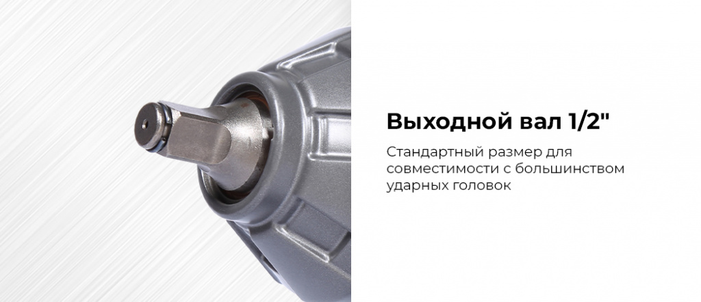 - Присоединительный размер квадрата вала 1/2" – стандартный размер для совместимости с большинством ударных головок, обеспечивающий универсальность и удобство работы;
