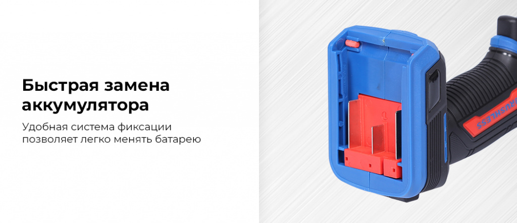 - Быстрая замена аккумулятора: удобная система фиксации позволяет легко менять батарею;