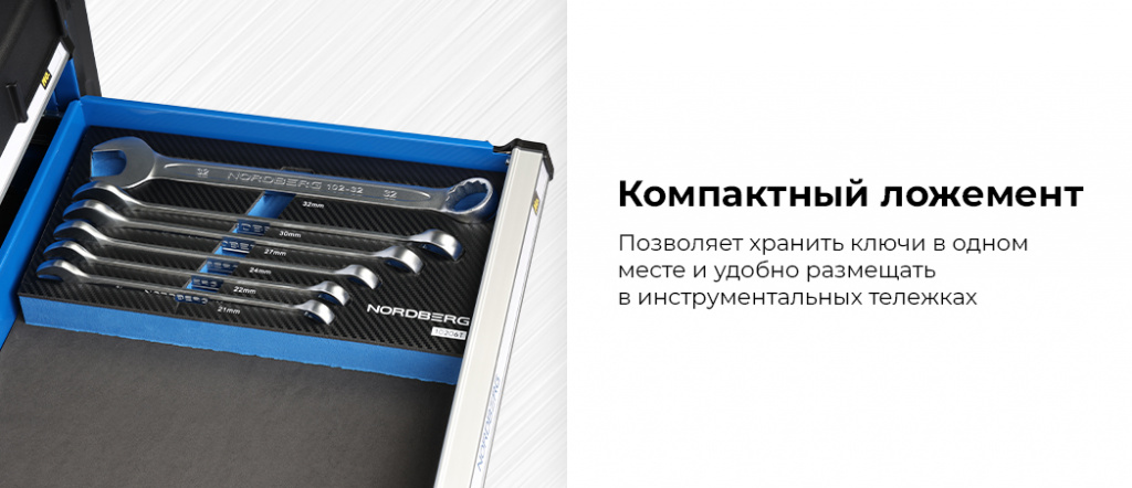 - Ключи размещены в компактном ложементе — он позволяет хранить их в одном месте и удобно размещать в инструментальных тележках;